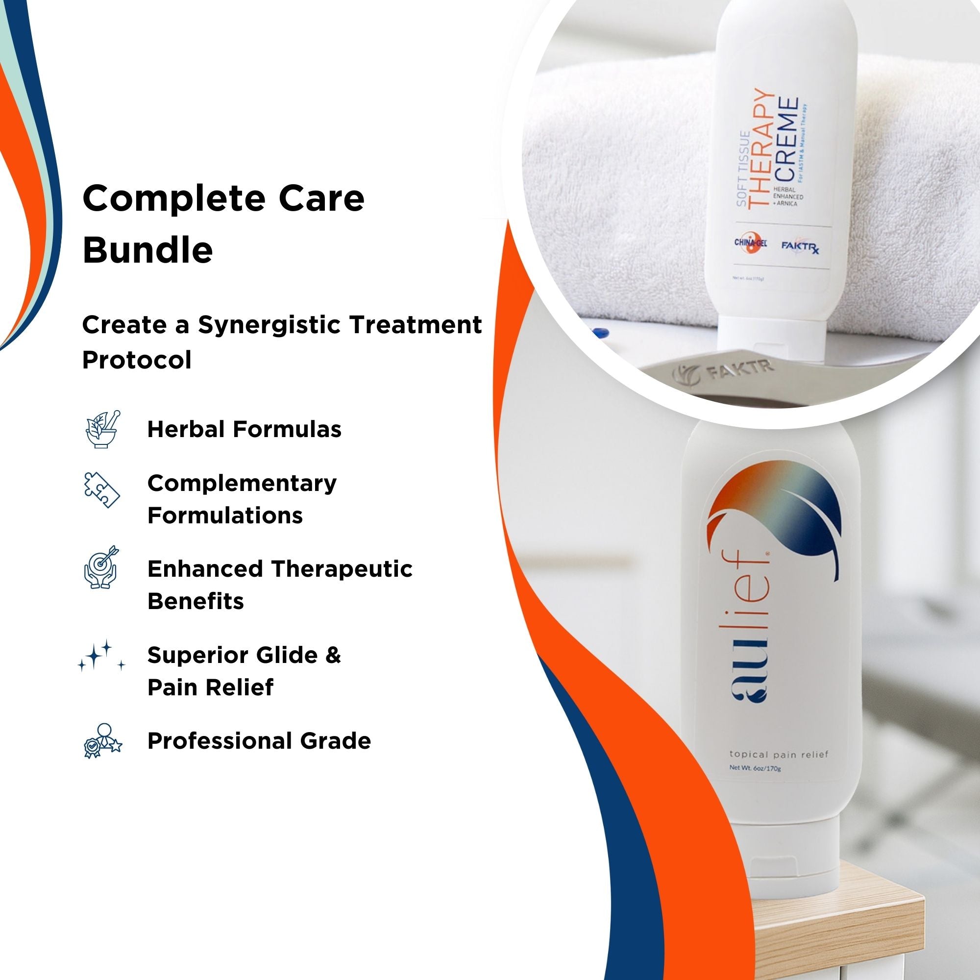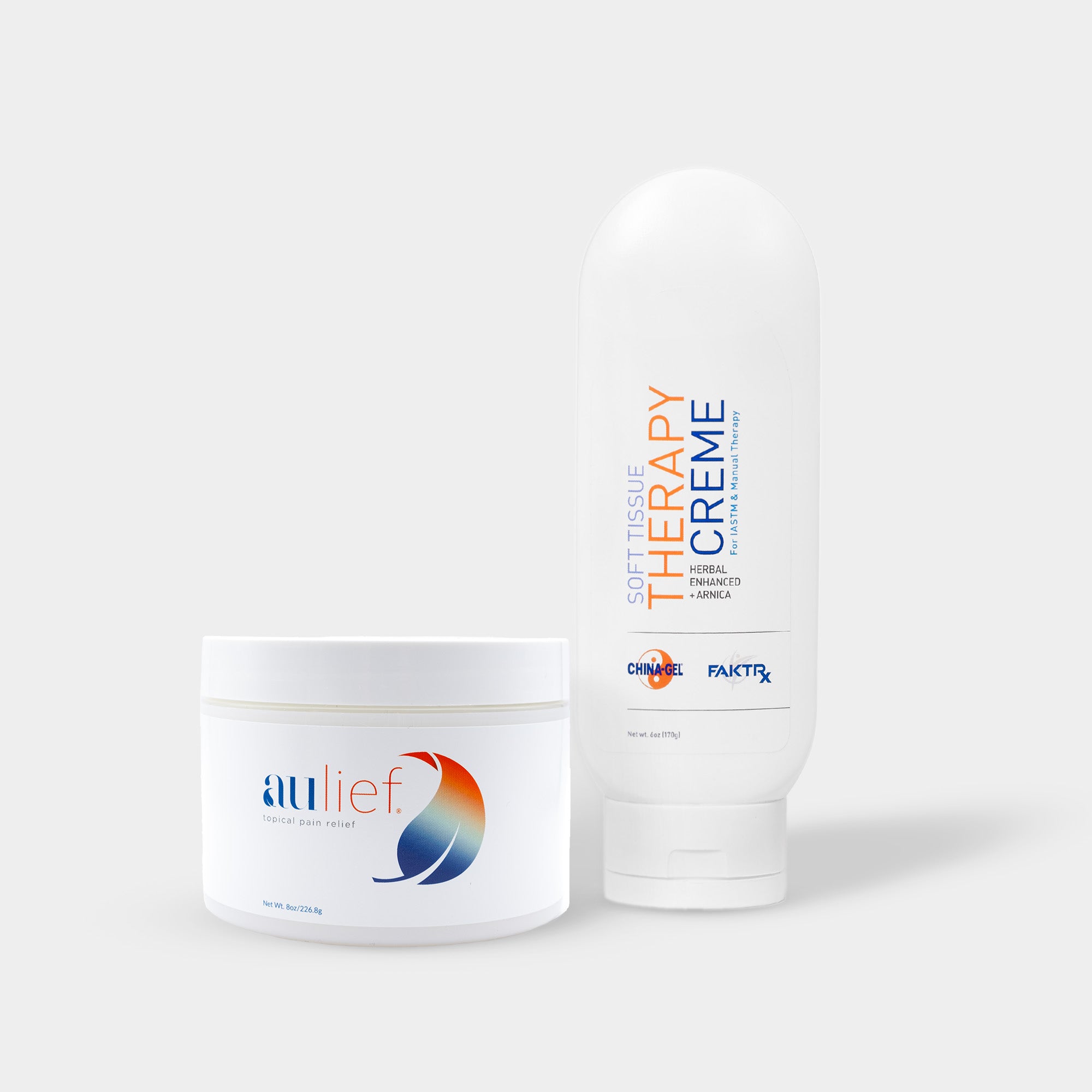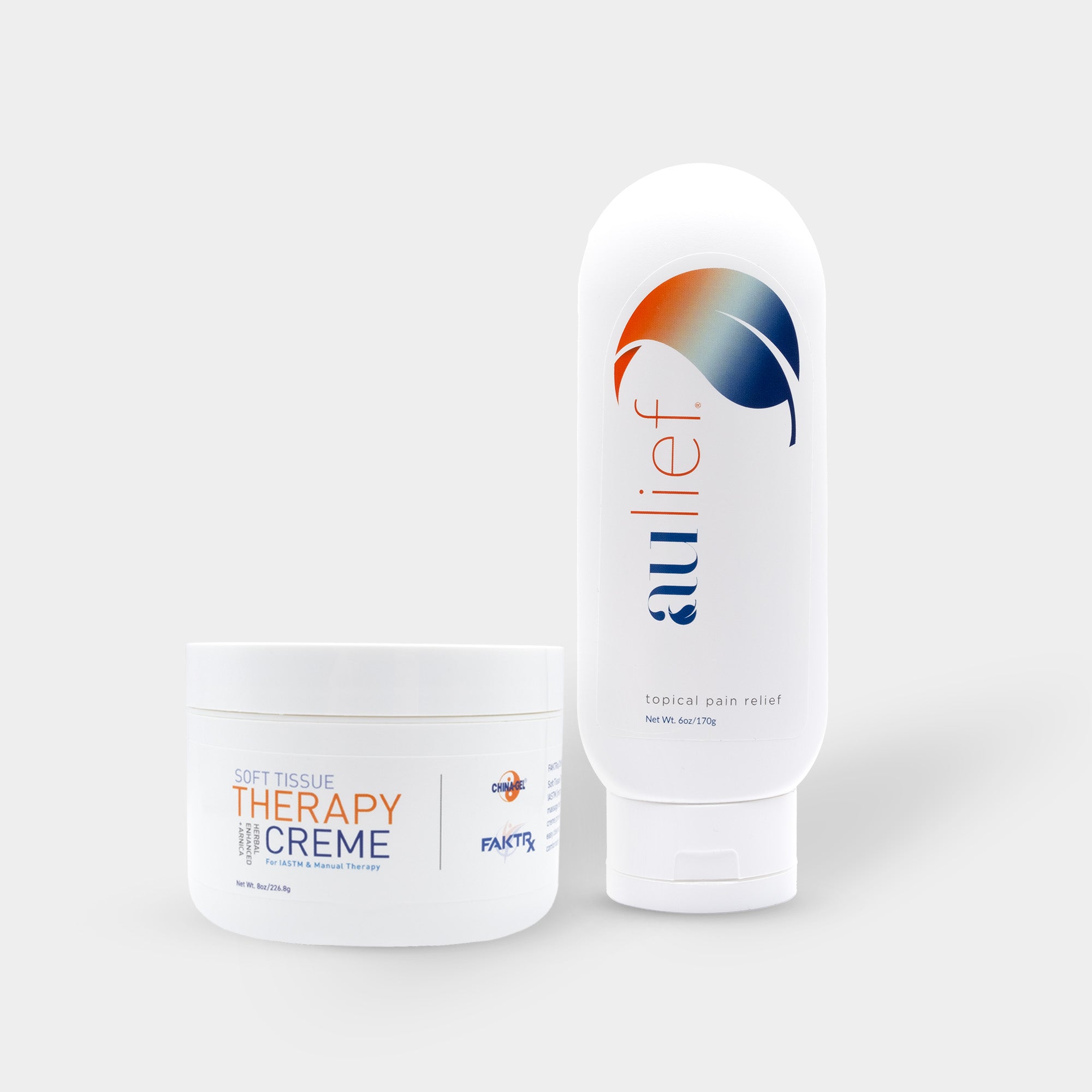Yes! This bundle is specifically designed for therapeutic massage applications. aulief can be used during massage for pain relief, while Therapy Creme is formulated with superior glide for extended massage work, IASTM, and manual therapy techniques. Many practitioners use them together - aulief for initial pain relief, then Therapy Creme for extended bodywork.